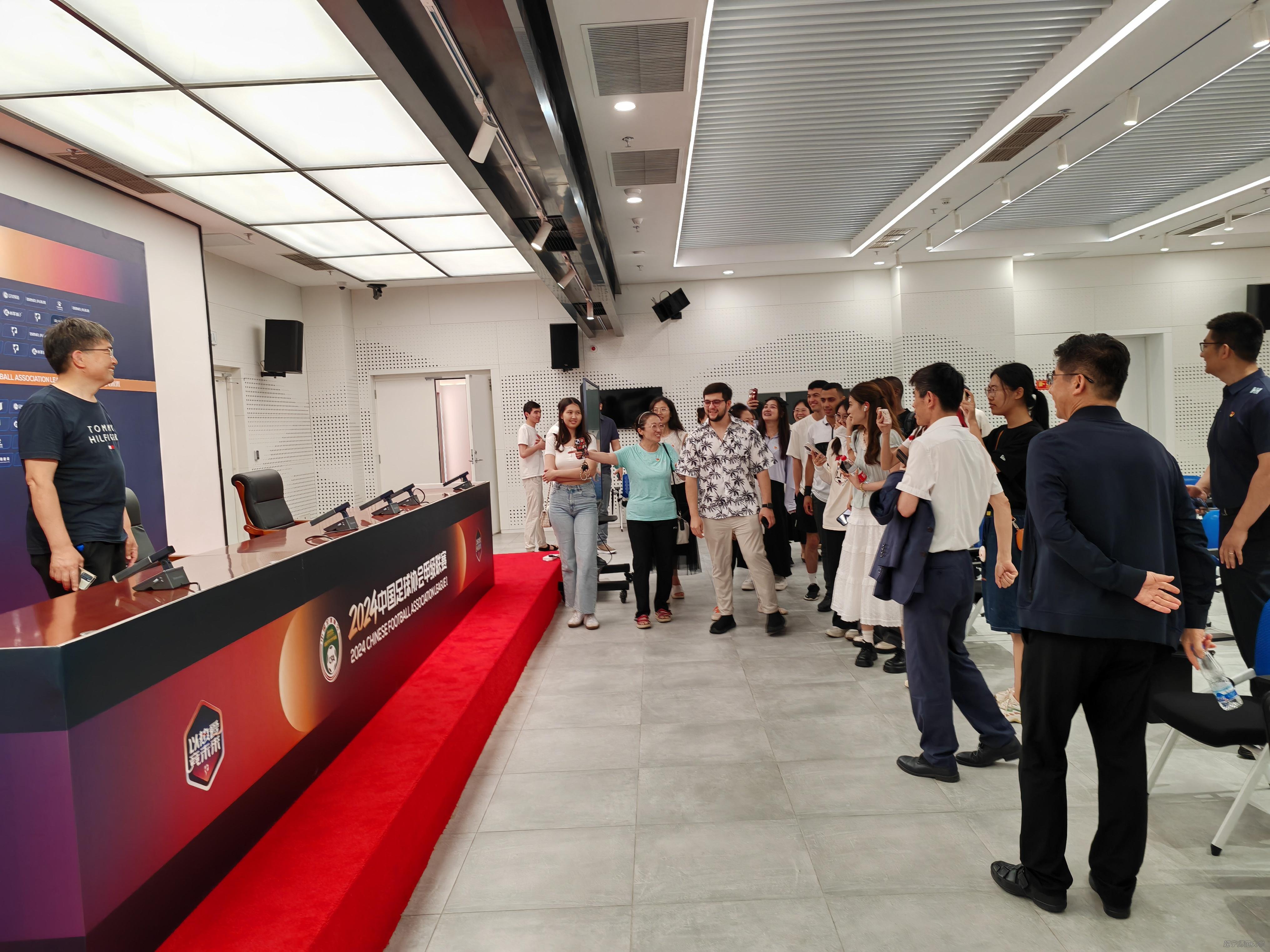 师生们首先来到了新闻发布厅。这里宽敞明亮,设备齐全,经常用于举办各类新闻、赛事发布等活动。随后,大家来到三层休息室,体验了最佳观赛位置,将整个足球场地尽收眼底。最后,大家亲临足球场地。站在无比开阔的场地中央,环顾四周蓝白相间的看台,感叹着球场的壮观,想象着看场球的惬意。此外,大家还深入了解了足球场的运营和管理情况。